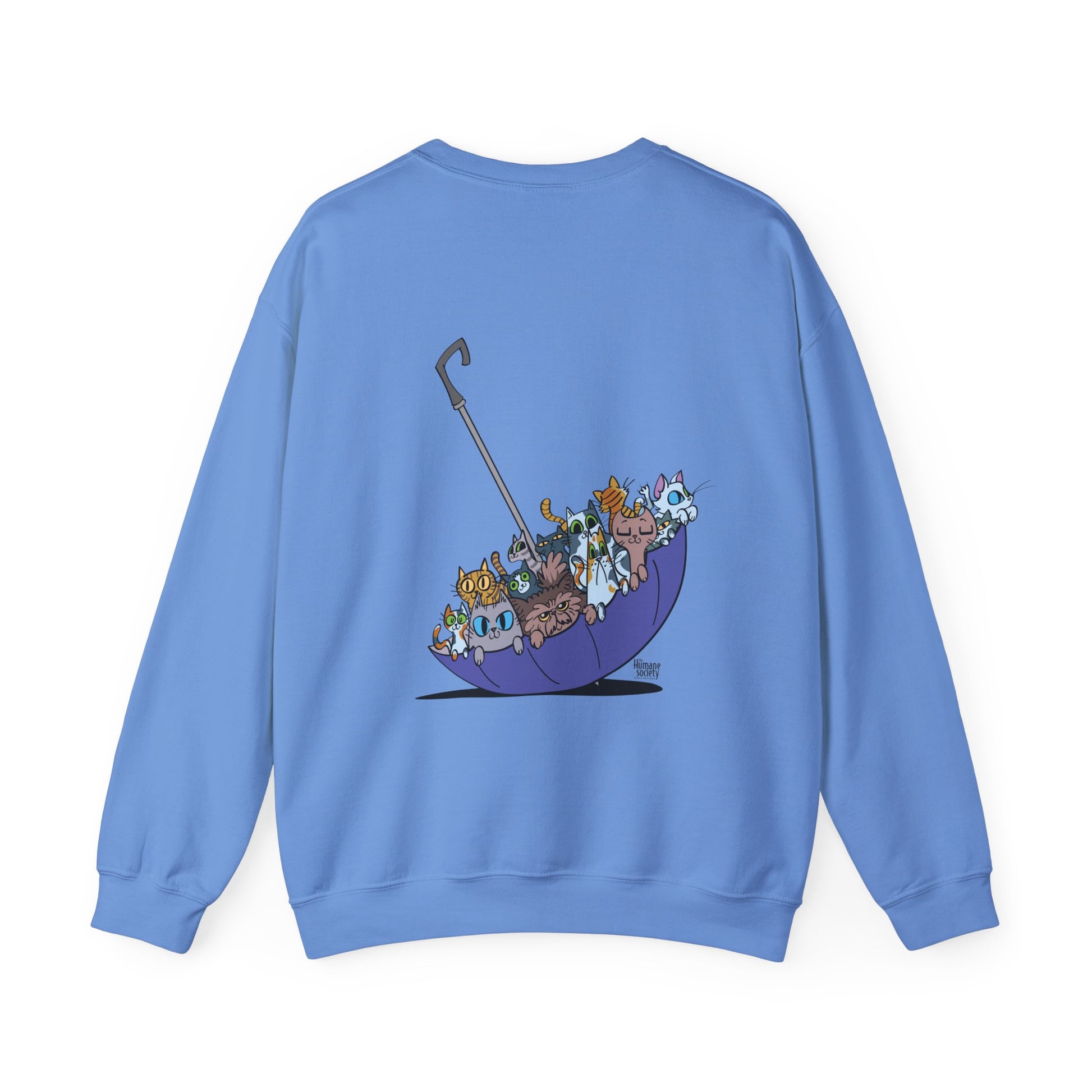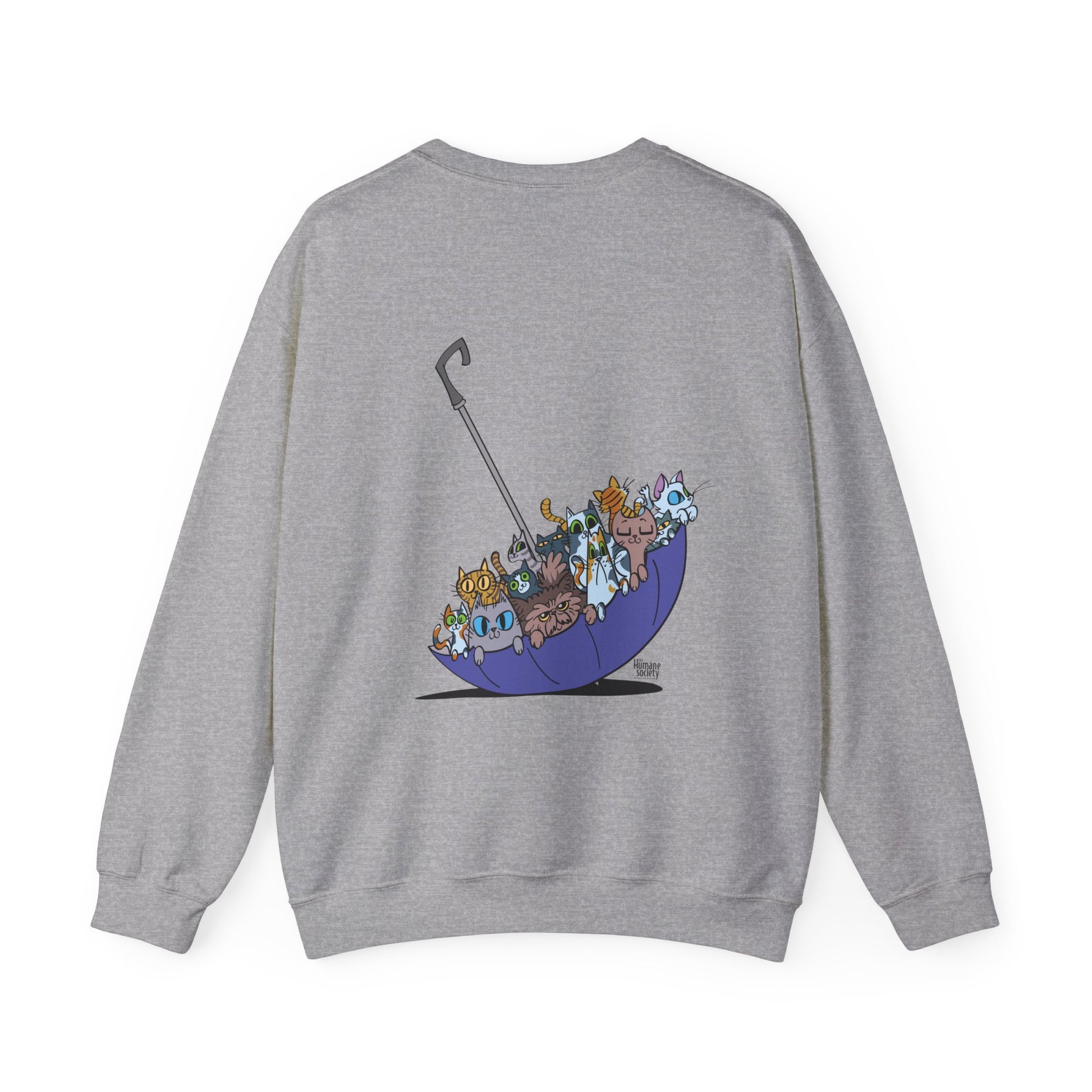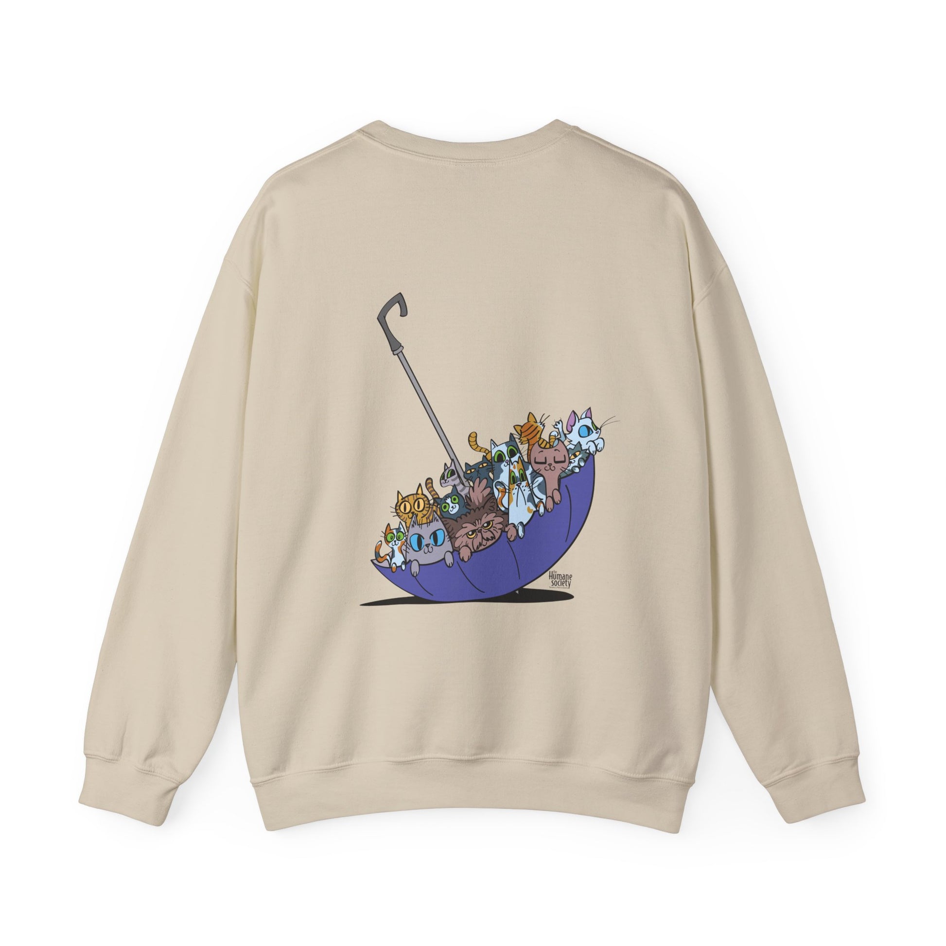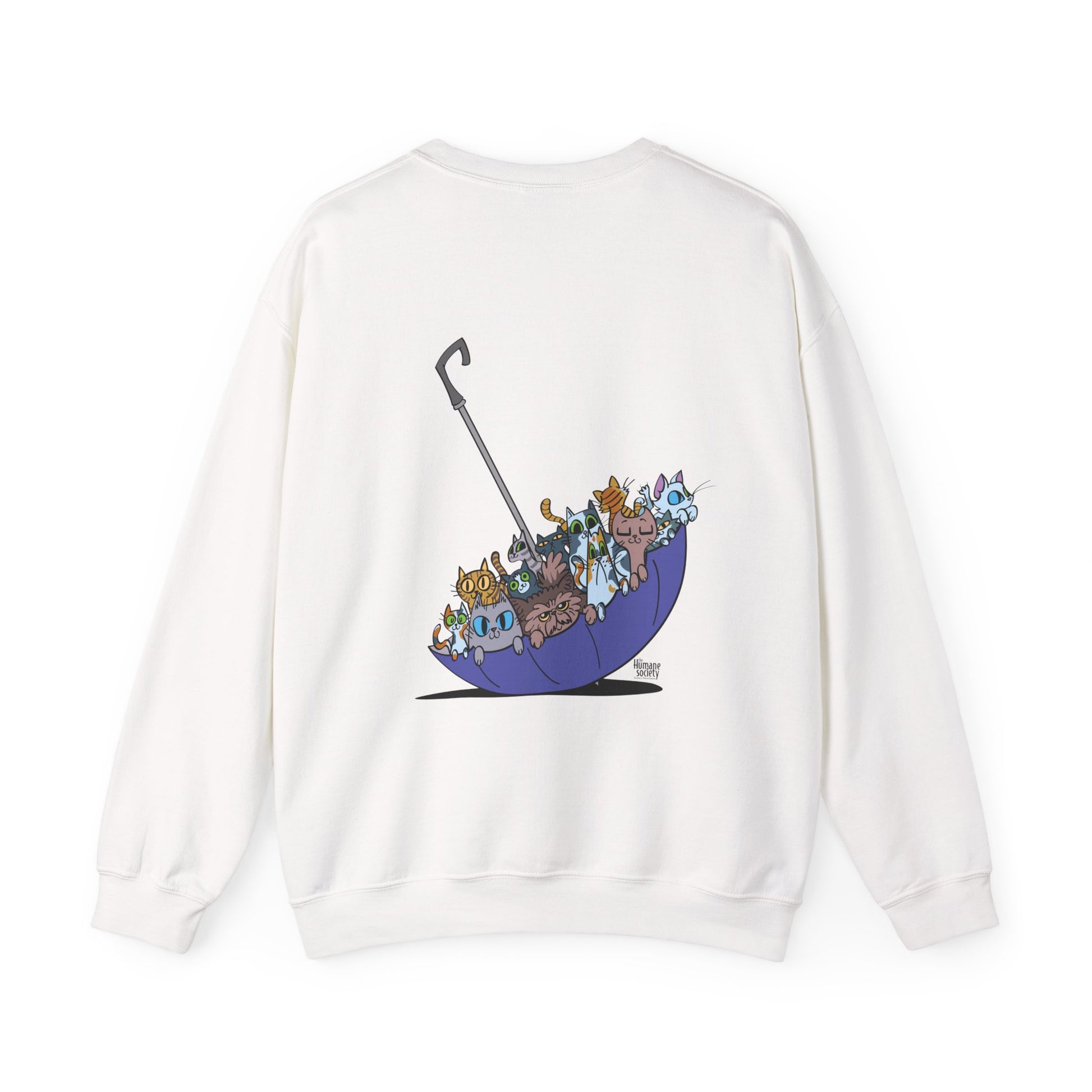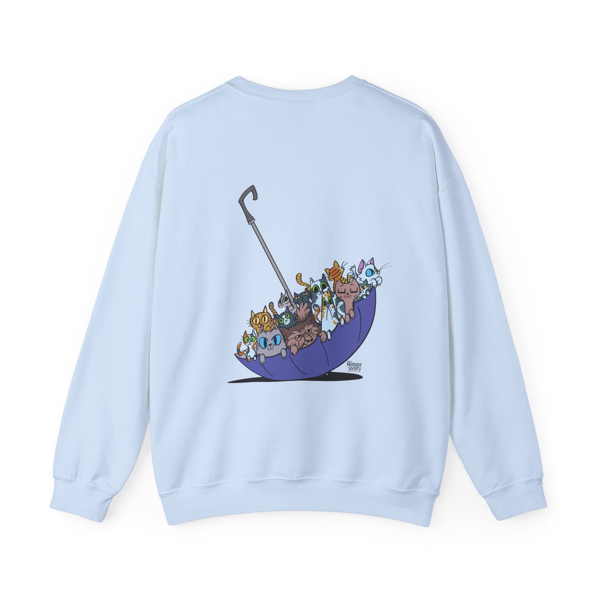 Our Spring Forecast for this Kitten Season is a 100% chance of kittens! The back showcases an adorable illustration of various cats nestled in a colorful umbrella, adding a charming touch to your outfit.