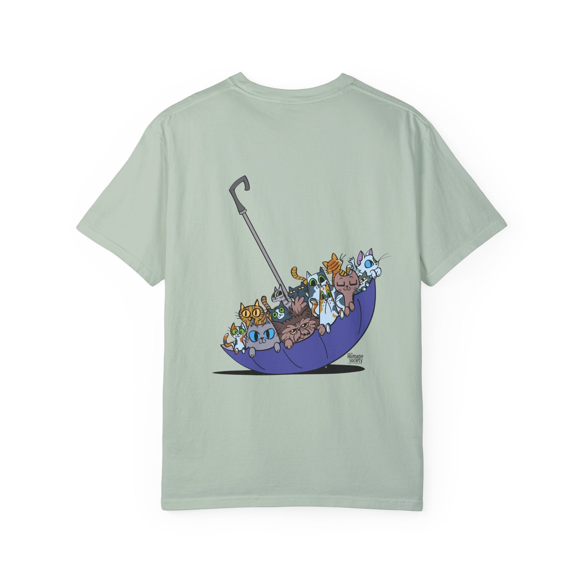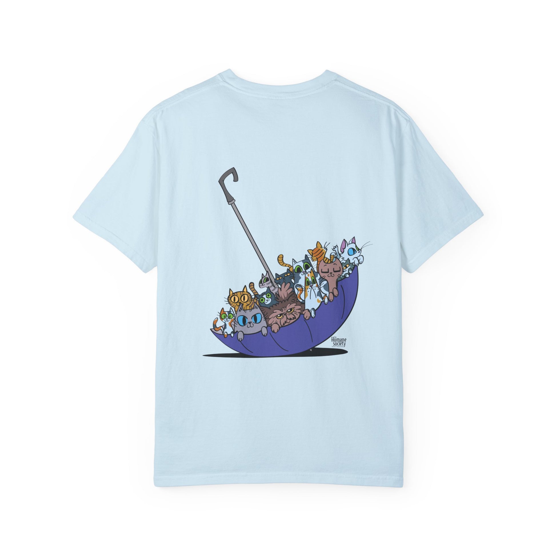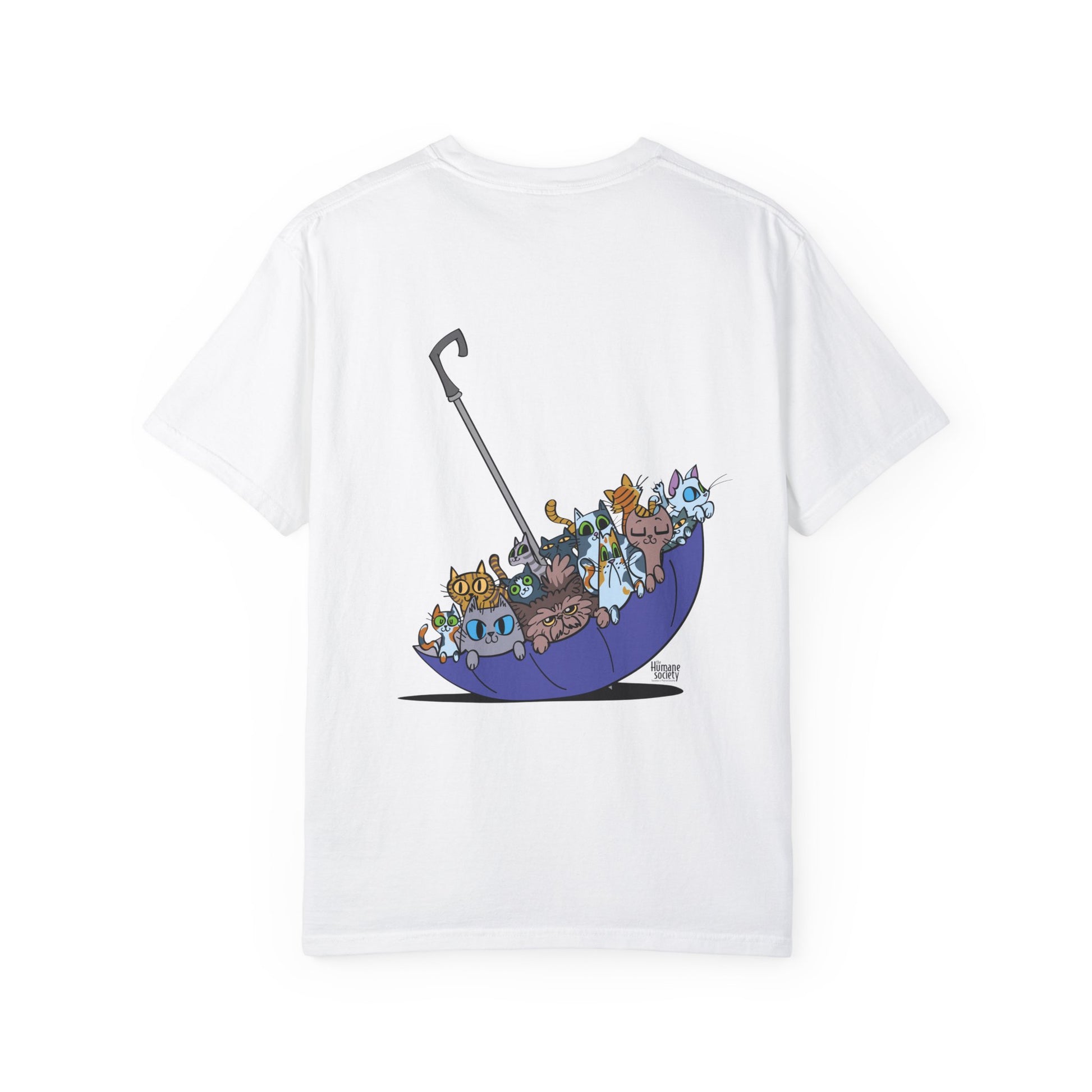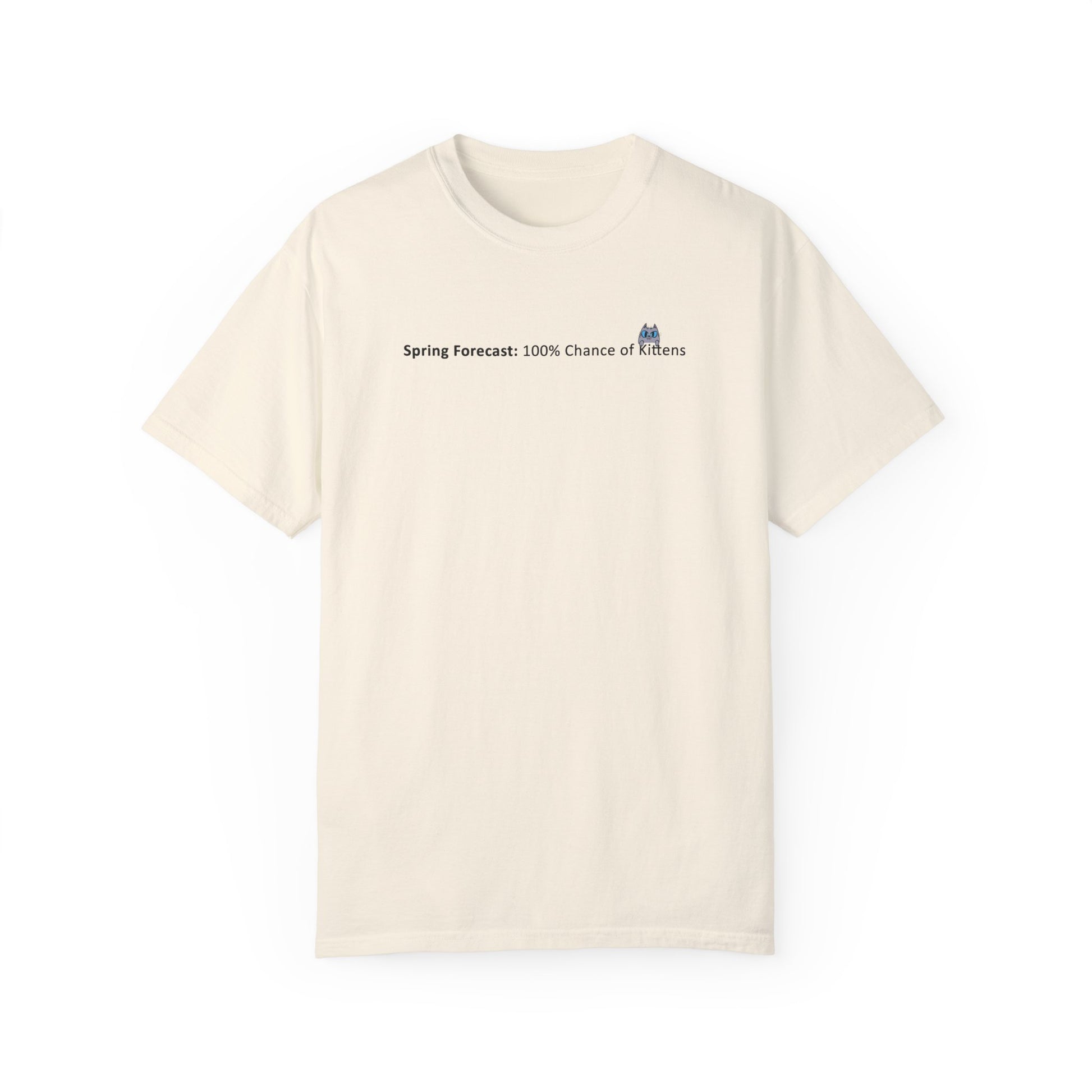 Our Spring Forecast for this Kitten Season is a 100% chance of kittens! The back showcases an adorable illustration of various cats nestled in a colorful umbrella, adding a charming touch to your outfit.