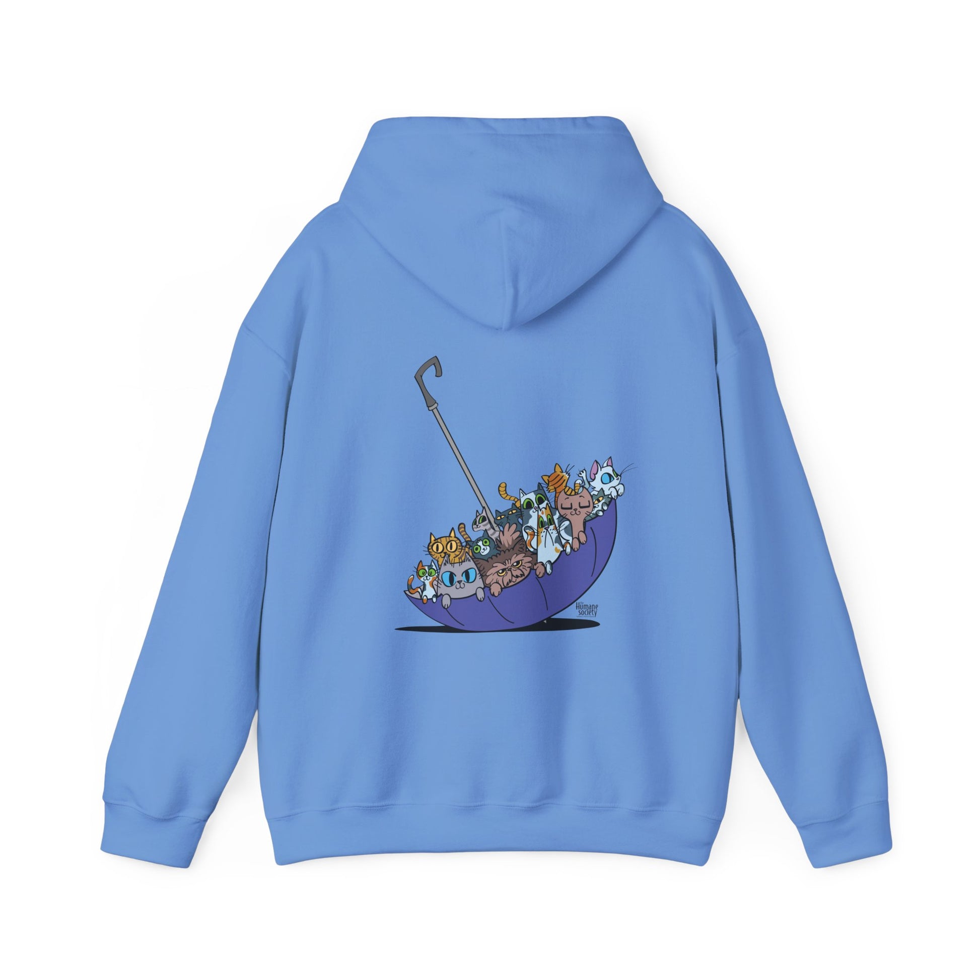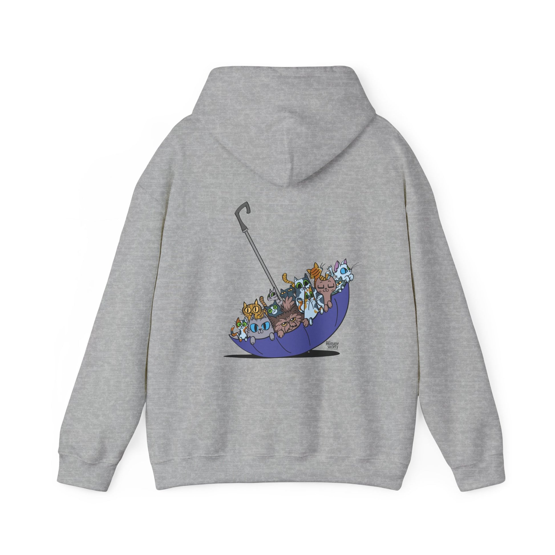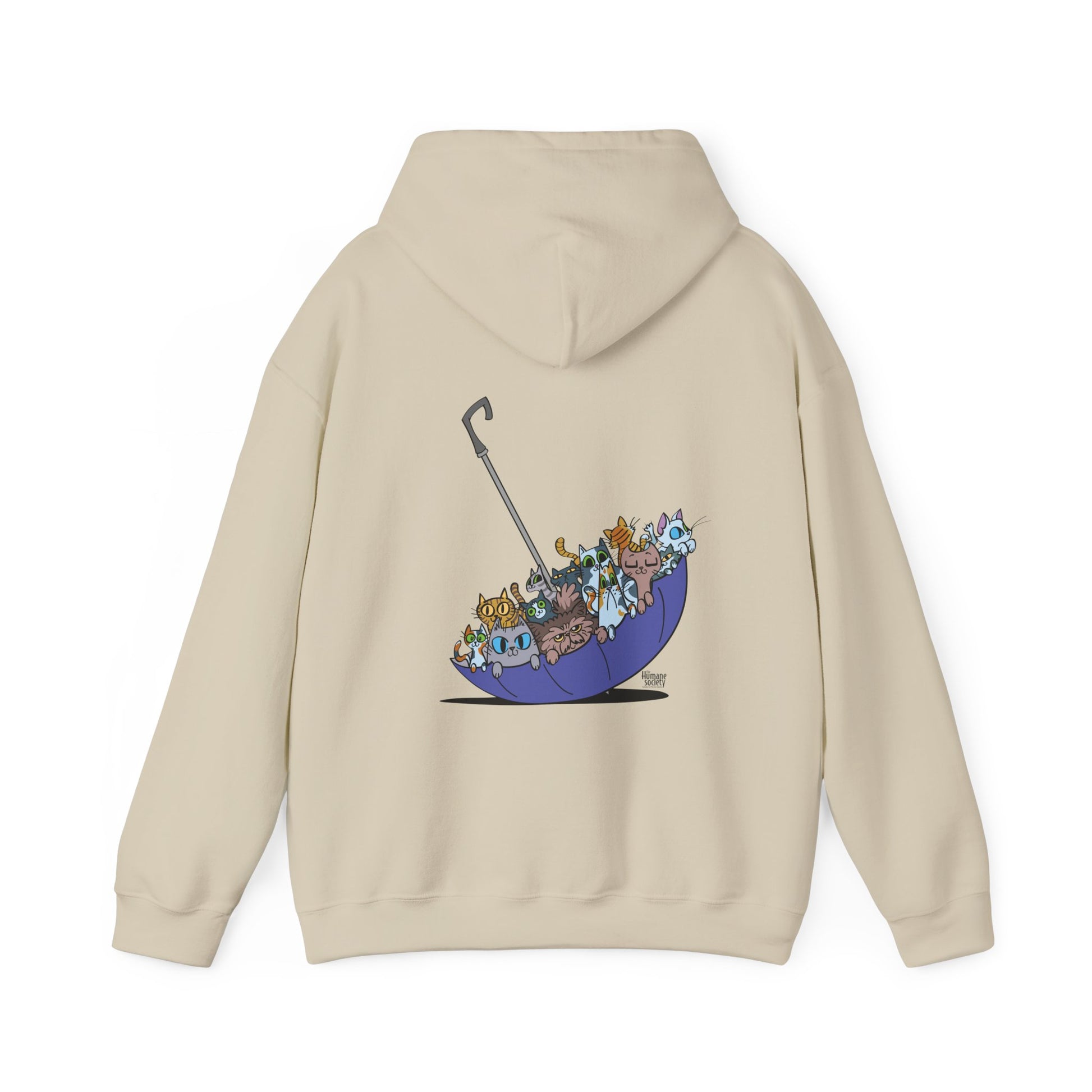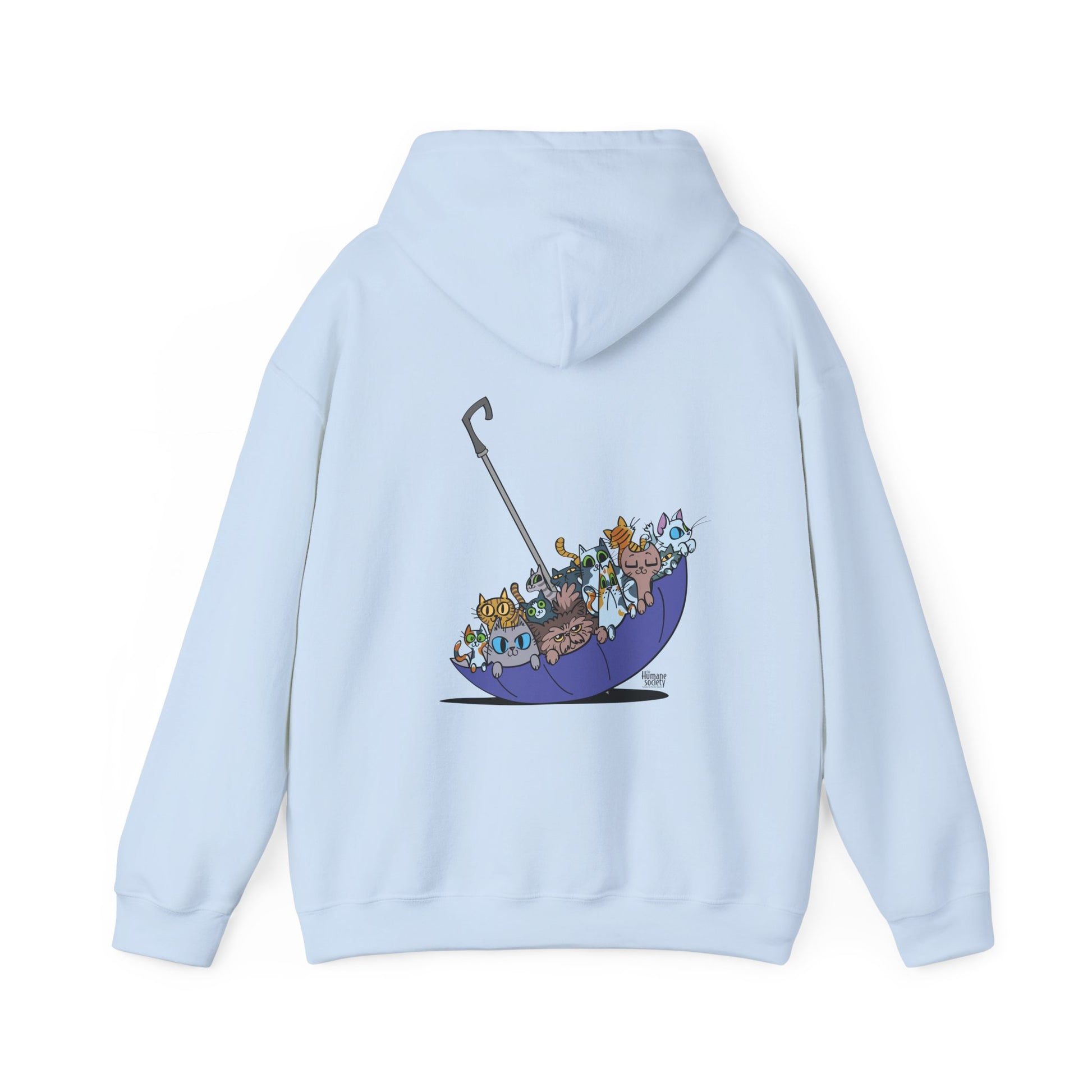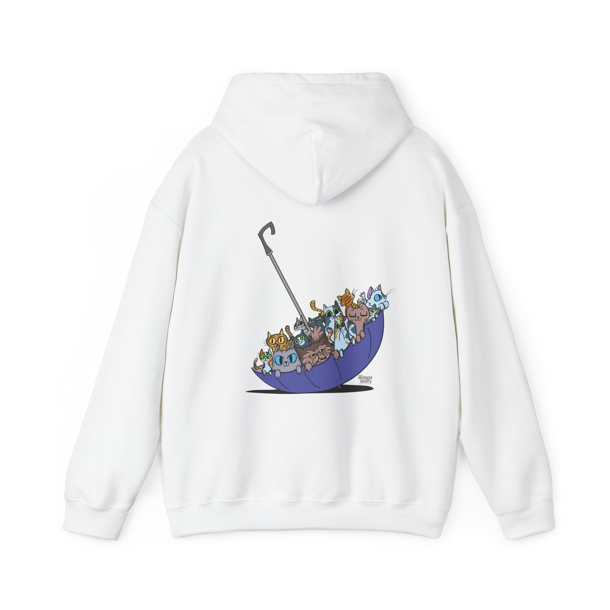 Our Spring Forecast for this Kitten Season is a 100% chance of kittens! The back showcases an adorable illustration of various cats nestled in a colorful umbrella, adding a charming touch to your outfit.