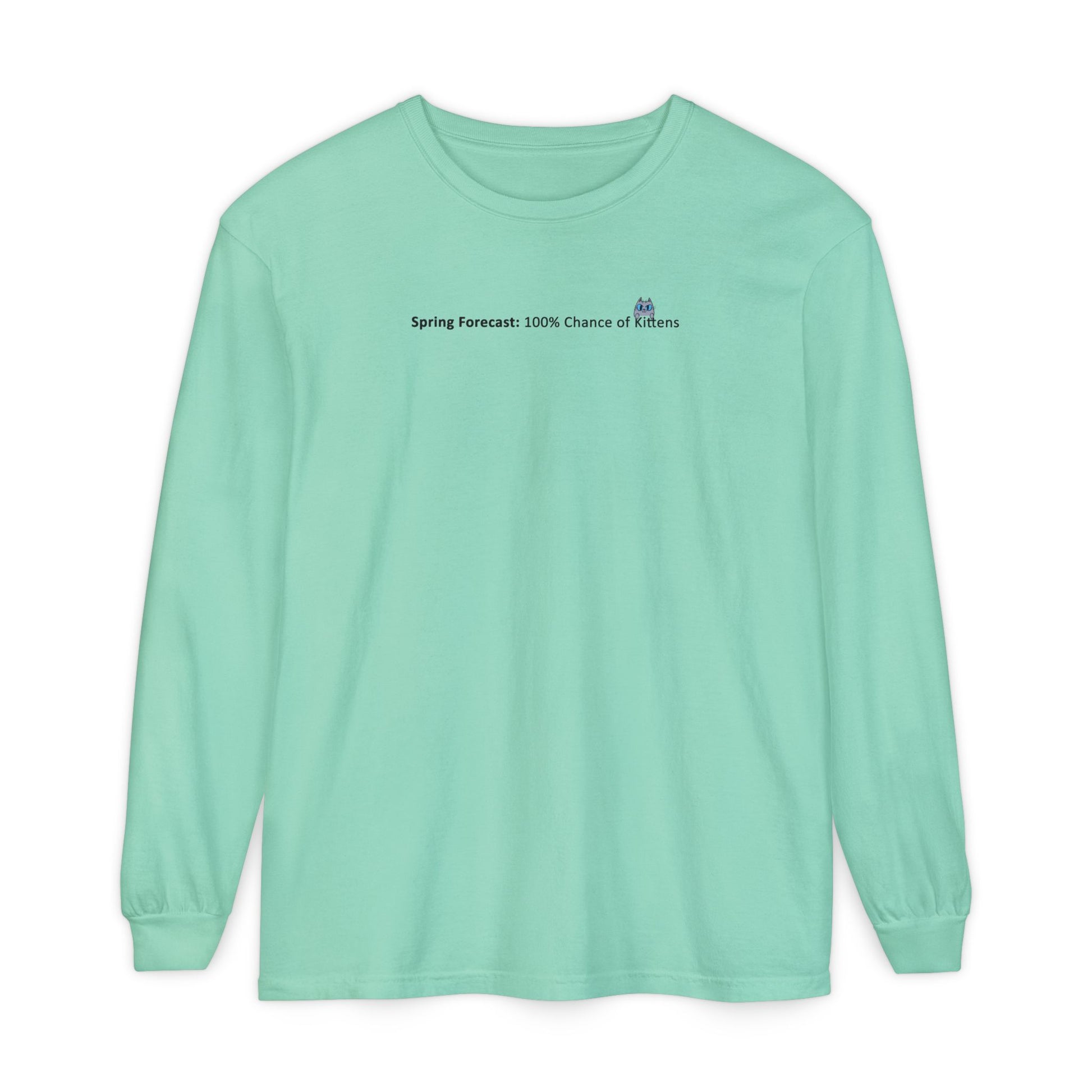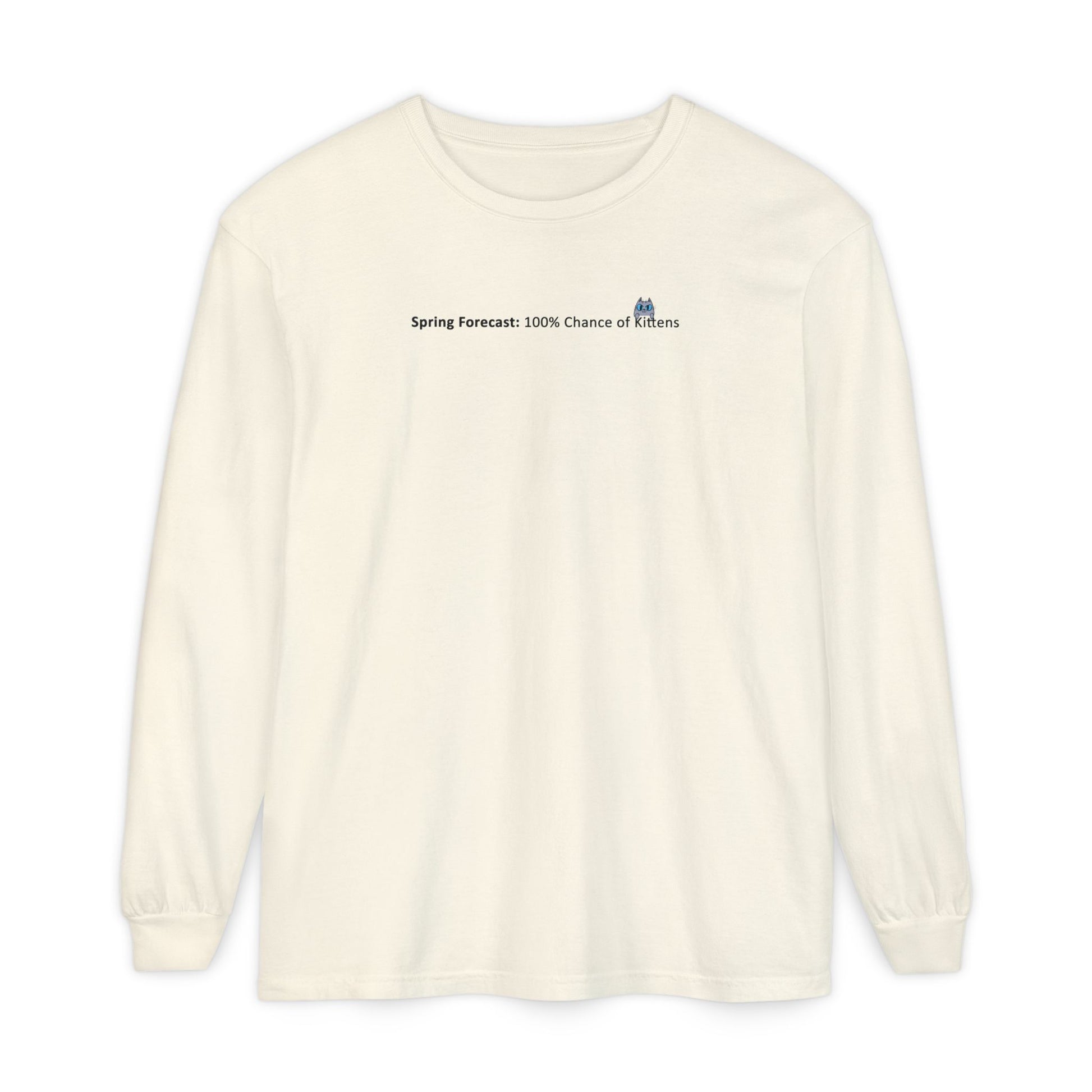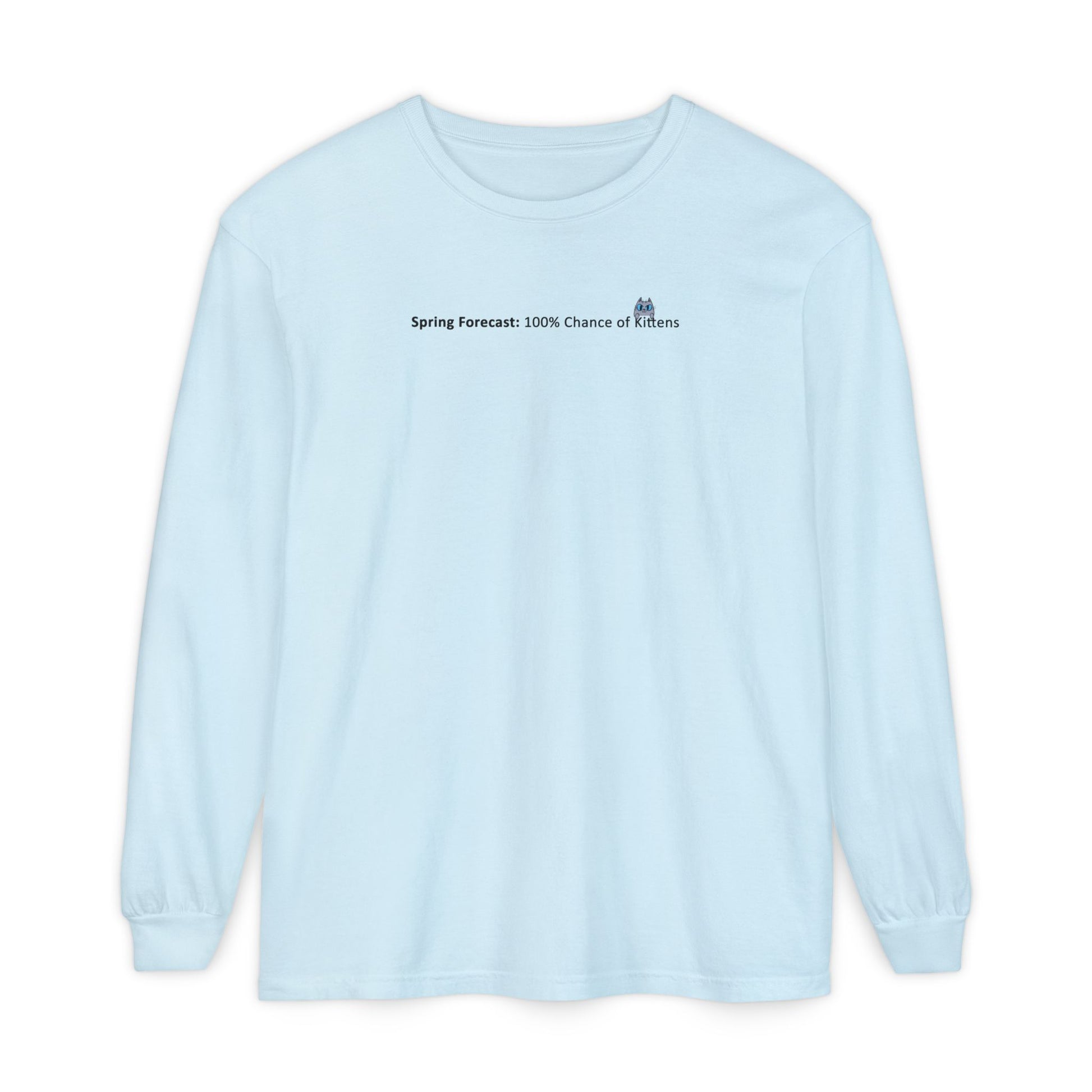 Our Spring Forecast for this Kitten Season is a 100% chance of kittens! The back showcases an adorable illustration of various cats nestled in a colorful umbrella, adding a charming touch to your outfit.
