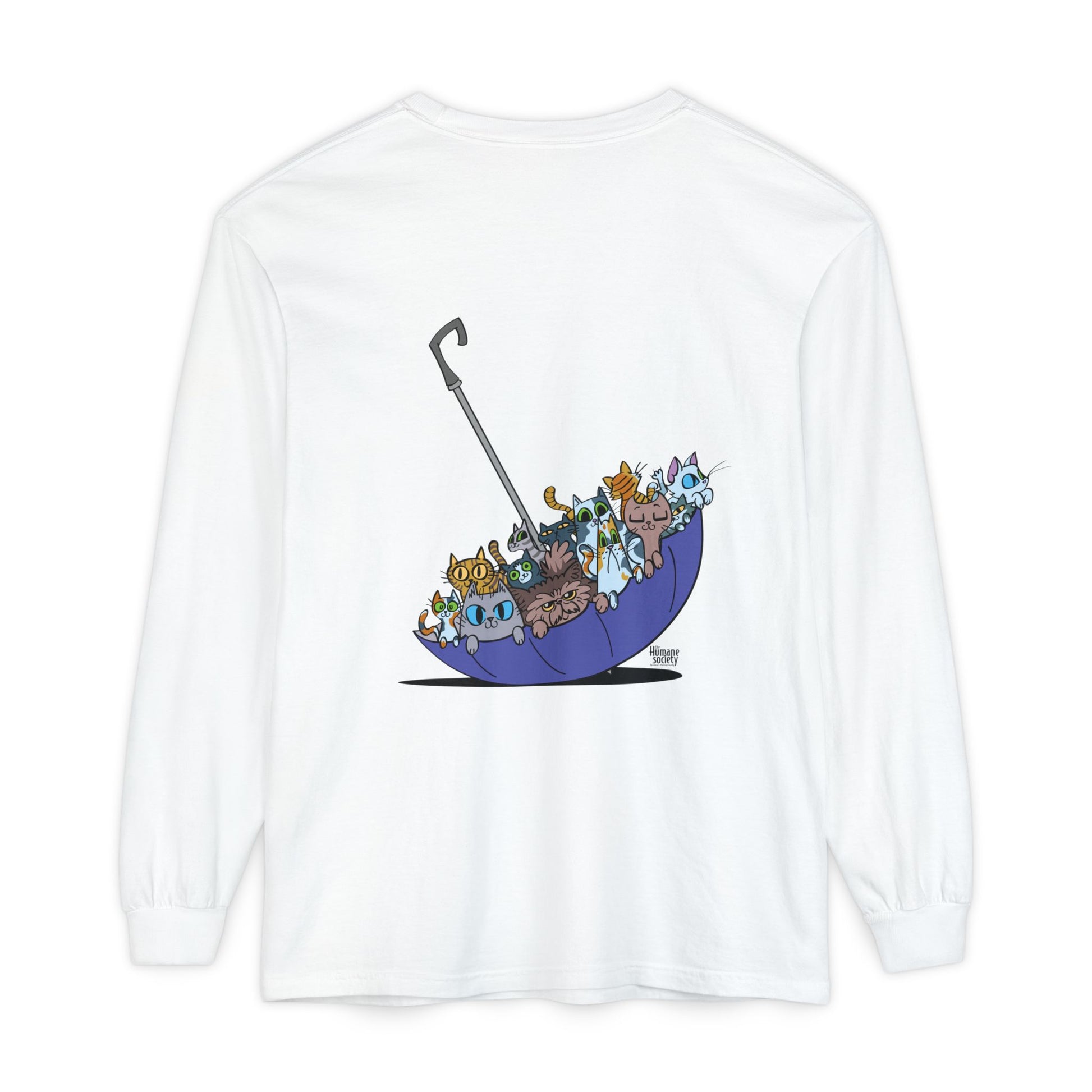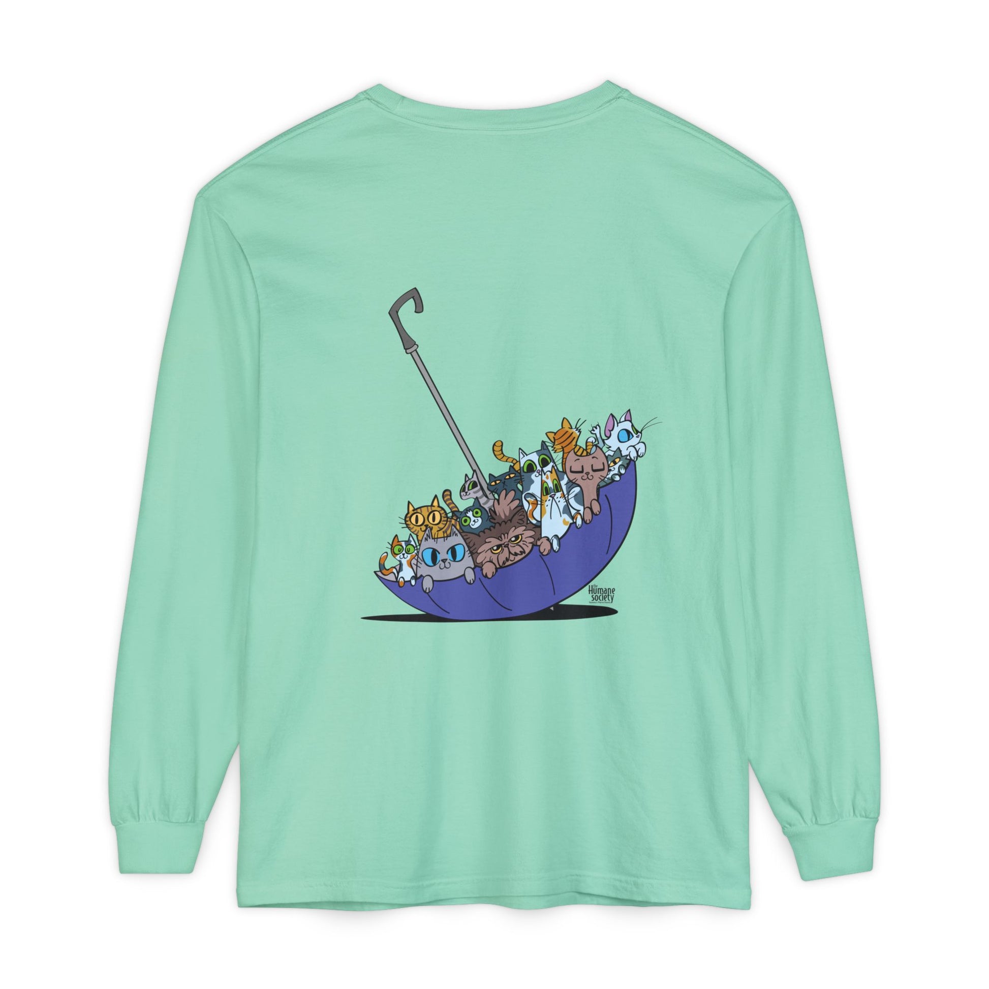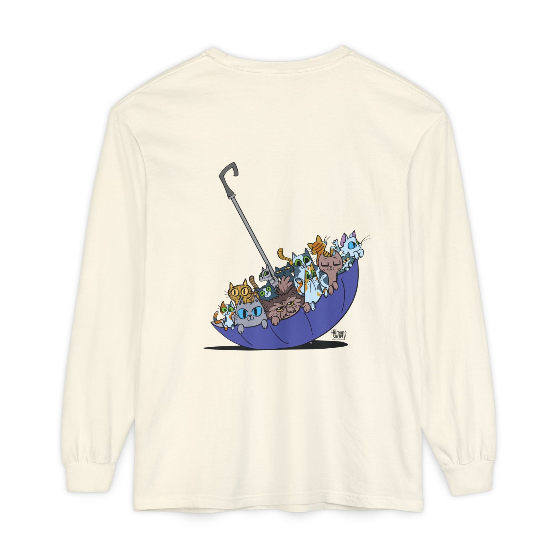 Our Spring Forecast for this Kitten Season is a 100% chance of kittens! The back showcases an adorable illustration of various cats nestled in a colorful umbrella, adding a charming touch to your outfit.